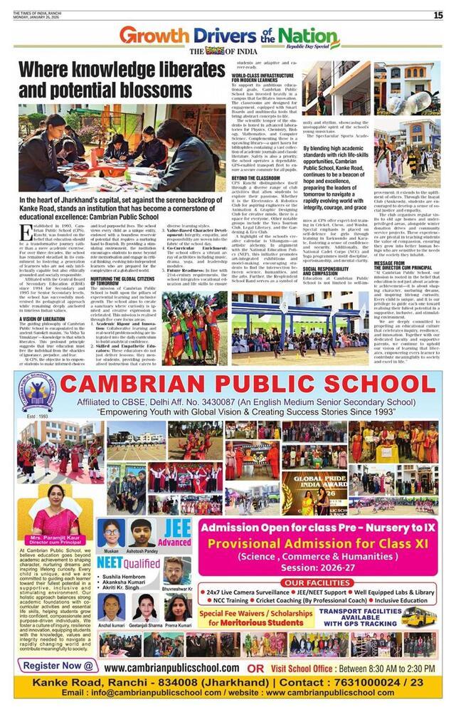 An Inter-House Patriotic Group Song Competition was organised with great enthusiasm at Cambrian Public School, Kanke Road, Ranchi, to instil patriotism and unity among students. The event began with the lighting of the lamp by the Director cum Principal, Mrs. Paramjit Kaur.